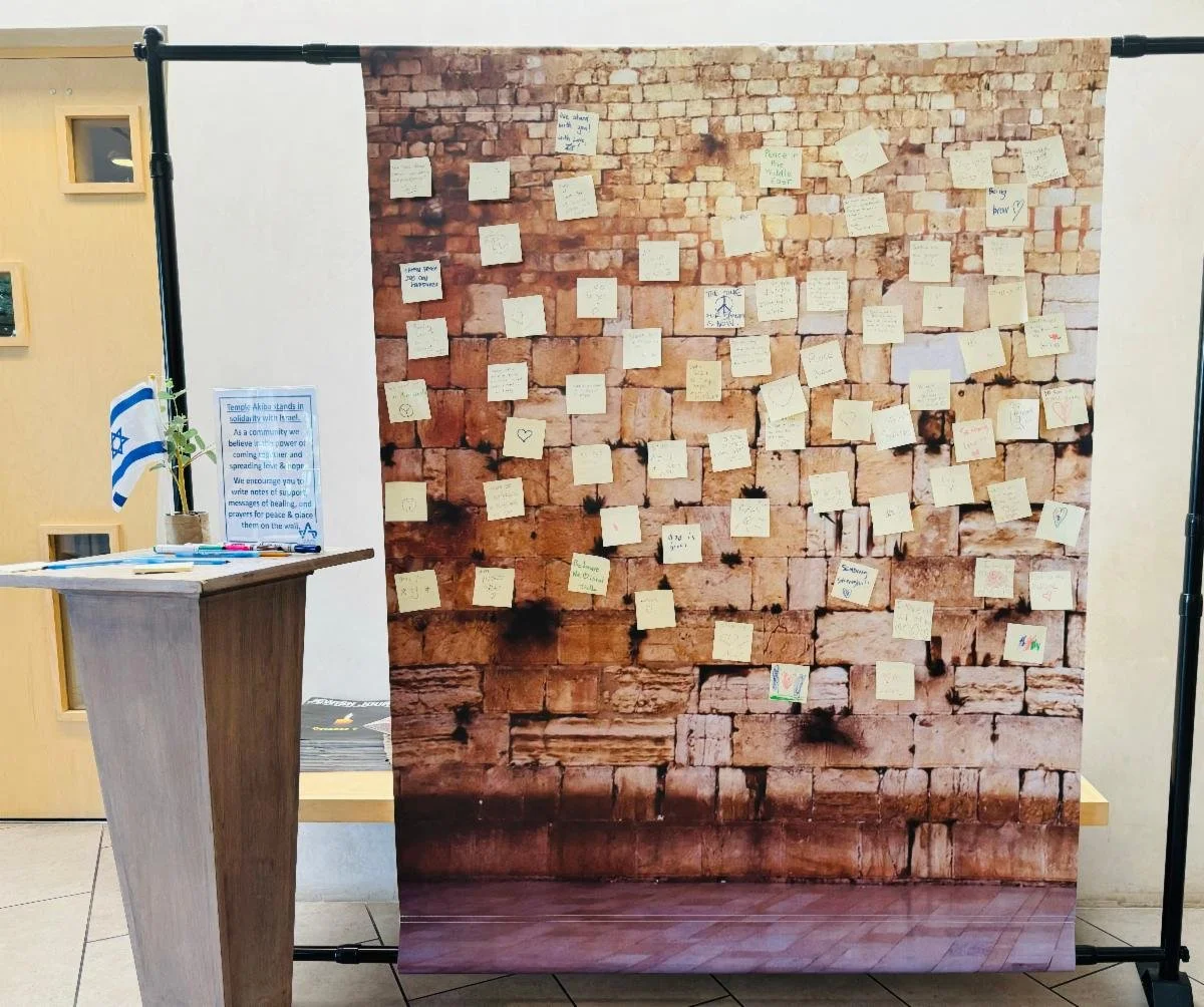In the ongoing trauma following the Oct 7 Hamas terrorist attack, Temple Akiba has put out a “Western Wall” on which we invite all to post a prayer (similar to how people insert prayers and notes into the Western Wall in Jerusalem).