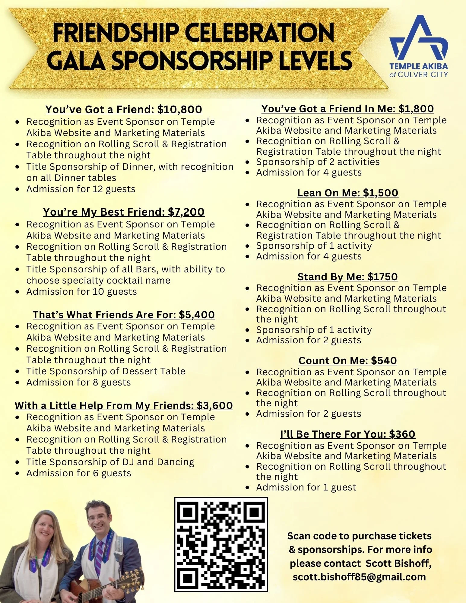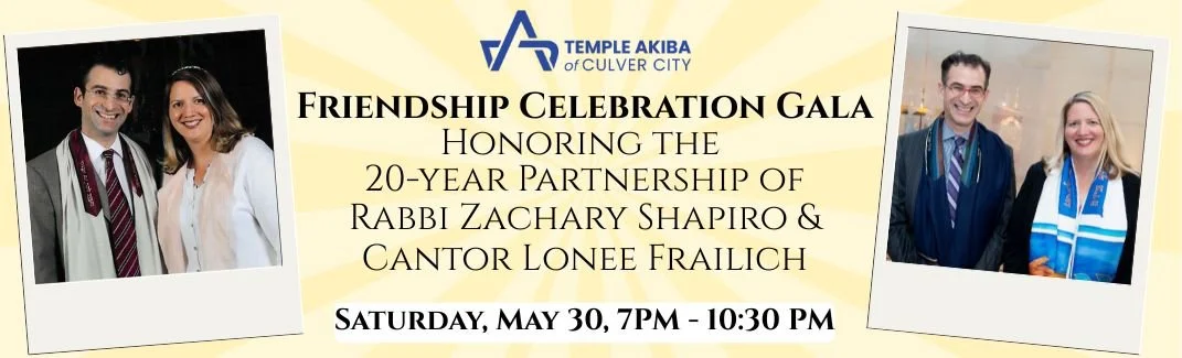 Celebrate Rabbi Zachary Shapiro & Cantor Lonee Frailich’s two decades of leadership, partnership, and community at our Friendship Celebration Gala. Join us for an unforgettable evening of joy, gratitude, & connection as we recognize 20 years of inspiring service, meaningful collaboration, & lasting impact. Enjoy a festive night of community, music, and celebration as we honor this remarkable milestone together. Includes dinner, open bar, music, dancing, prizes & activities inspired by our Dynamic Duo. For more information please contact Scott Bishoff, scott.bishoff85@gmail.com