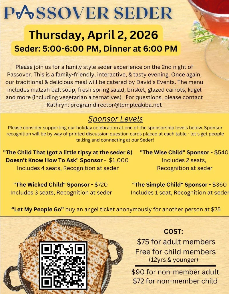 Please join us for a family style seder on the 2nd night of Passover. If you've joined us for an Akiba Passover Seder in the past, you know this is a family-friendly, interactive, joyful and tasty evening. Once again, our traditional & delicious meal will be catered by David's Events.