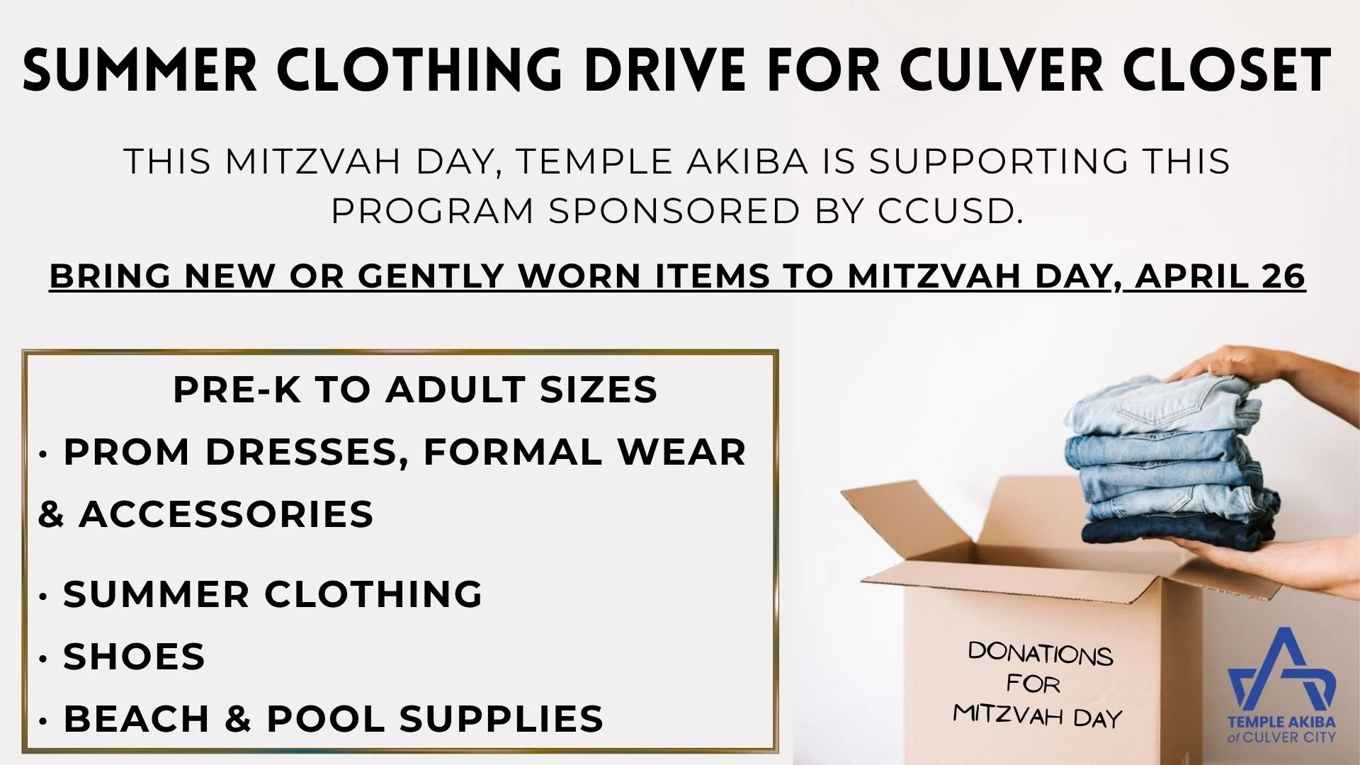 From the Annual Mitzvah Day to Shoes for the Homeless and Jewish World Watch events, Temple Akiba does not stand idly by. Rather, Temple Akiba educates and activates its community to rise up and take responsibility for helping to care for others in need.